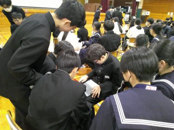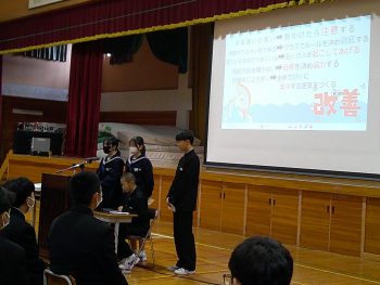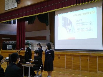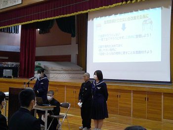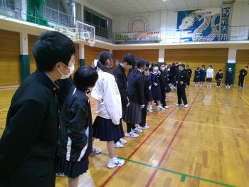 集会では、2学期の振り返りや冬休み中の生活についての話があり、生徒たちは真剣な表情で耳を傾けていました。