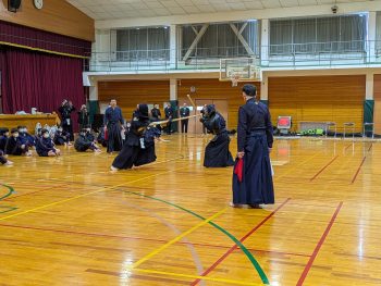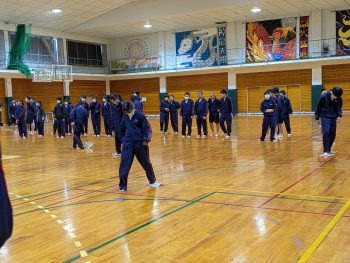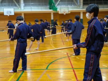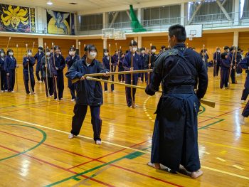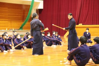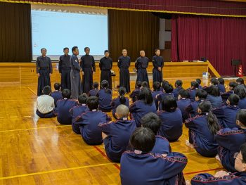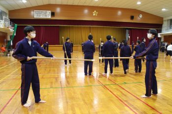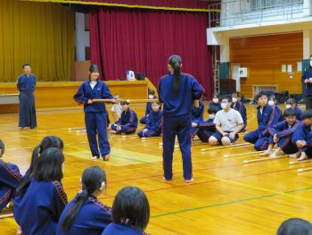 2年生は、グループごとに突きの練習をし、各グループで選ばれた代表による突き技の発表会を行いました。その後、講師の方による銃剣道の型を披露していただきました。気迫に圧倒されていましたが、美しい所作や、俊敏な体さばきや素早い足さばき、強い打突等、熟練の技を身近で観戦することができ、貴重な機会となりました。