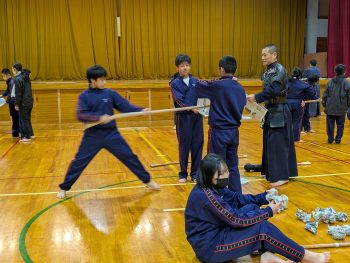 最初に銃剣道での礼儀作法などを教えていただきました。1年生は、実際に木銃を使って新聞紙を突き破る体験をしました。