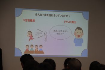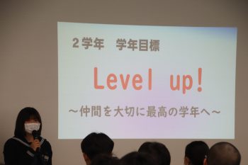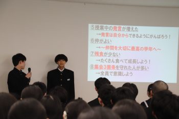 学年委員が準備をしてきたスライドを使いながら、2学年のよい点と改善点について報告を行いました。