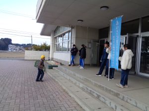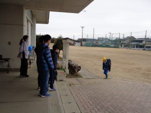 初日は、6年生と5年生が校門前、玄関前、ランチルーム前に立って