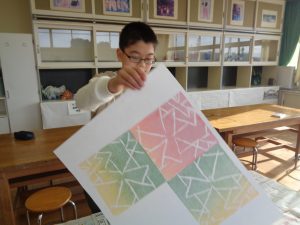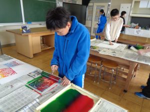 4回刷る際に、インクの色を変えたり、向きを変えたりして工夫していました。