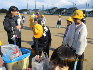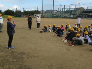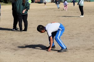 縦割り班でグラウンドにばらまいてあるコインを拾い集めます。