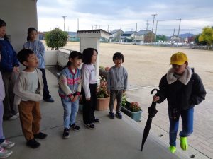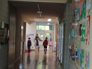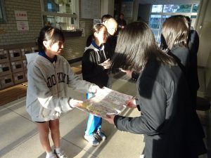 玄関前やランチルーム前に、1年生と6年生が立って挨拶を呼びかけました。