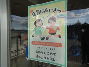 玄関前やランチルーム前で挨拶を呼びかけました。