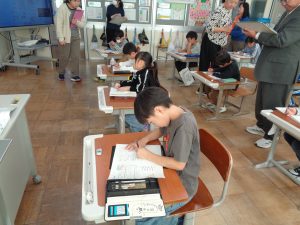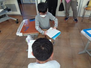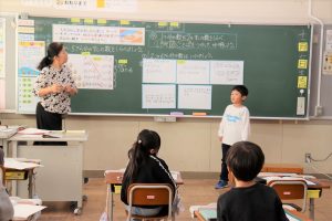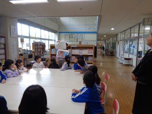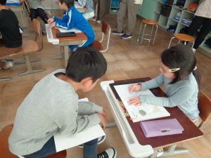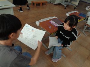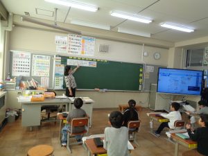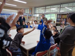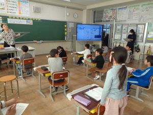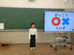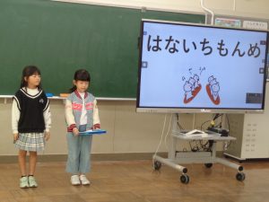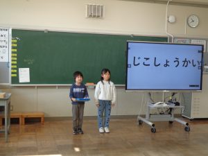 1年生教室では、自己紹介や学校クイズ、はないちもんめが行われました。