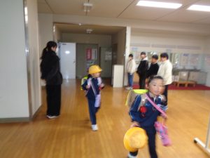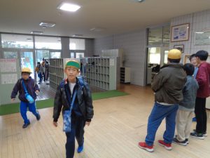 当番の5年生と6年生が玄関ホールとランチルーム前で挨拶を呼びかけました。