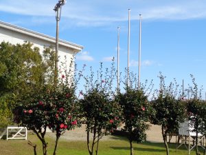 ふと窓の外を見ると、山茶花が見えました。