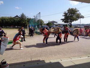 11日に万尾地区の祭りが行われ、学校にも獅子舞が来ました。