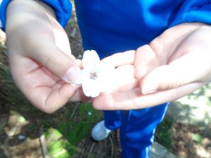 青空の下、縦割り班で春をたくさん見付けることができました。