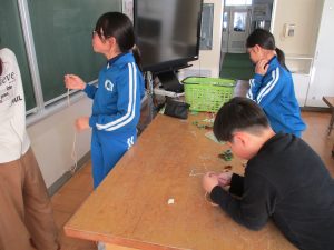 工作クラブは、組紐づくりをしていました。秋色カラーの紐を3本または4本組み合わせて編んでいきます。できあがった組紐を嬉しそうに見せてくれました。