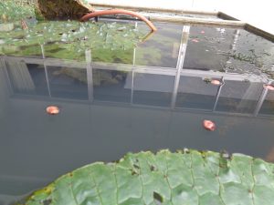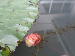 オニバスの葉の近くに赤い物がいくつも浮いていました。
