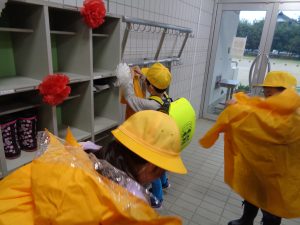 かっぱをぬいだ妹や弟に、かける場所を教える3年生・5年生。