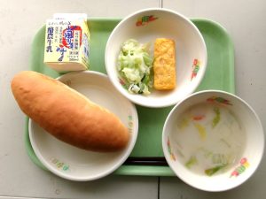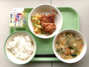 ごはん、牛乳、鶏の唐揚げ、卵と小松菜の中華スープ、即席漬け