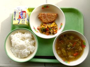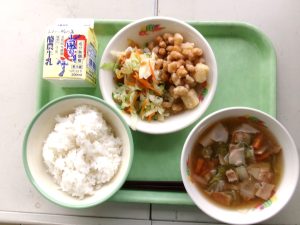 ごはん、牛乳、ミックスみそ豆、ワンタンスープ、キャベツの福神漬け和え
