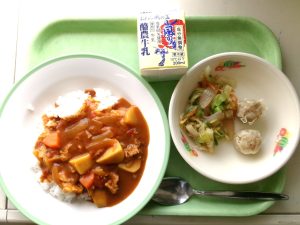 ごはん、牛乳、ポークシュウマイ②、冬野菜カレー、こんにゃくサラダ