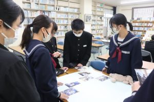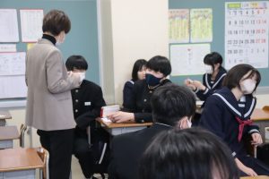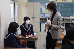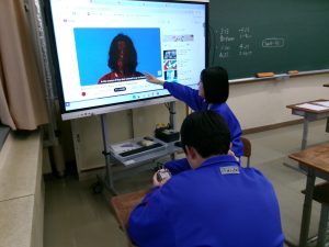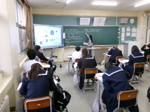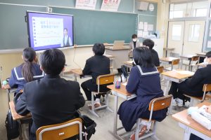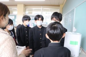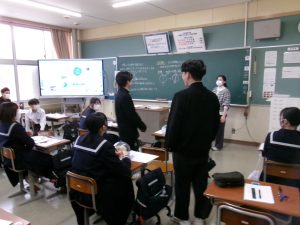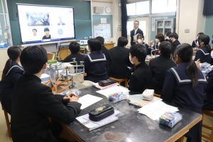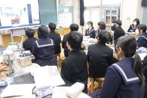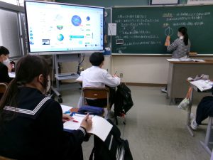 1年教室と名城大学をオンラインで結んで、2014年にノーベル物理学賞を受賞した「青色LED」について学習しました。ノーベル賞を受賞した理由や原理、効果、使用されている所を知りました。後半は、LEDを光らせるのに必要なエネルギー(電圧)を大学生と一緒に実験しました。
