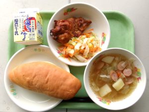 コッペパン、牛乳、タンドリーチキン、ポトフ、コーンサラダ