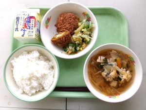 ごはん、牛乳、かぼちゃチーズフライ、キムチ汁、青菜のコーン和え