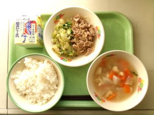 ごはん、牛乳、豚肉としらたきのピリ辛炒め、さつま汁、かぶの昆布和え