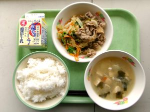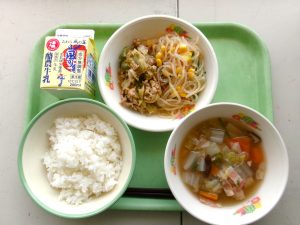 ごはん、牛乳、豚肉とたけのこの炒め物、じゃがいものみそ汁、三色和え