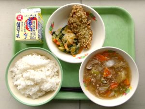 ごはん、牛乳、赤魚のカレー揚げ、なめこ汁、卯の花煮