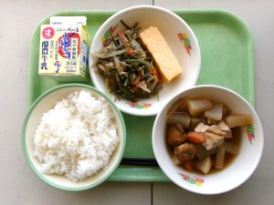 ごはん、牛乳、厚焼卵、野菜のうま煮、茎わかめのきんぴら