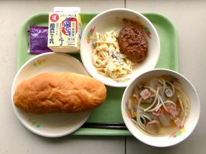 コッペパン、牛乳、照焼ハンバーグ、きのこのスープパスタ、アスパラサラダ、ブルーベリージャム