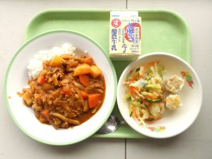 ごはん、牛乳、コーンシュウマイ②、氷見っ子カレー、こんにゃくサラダ