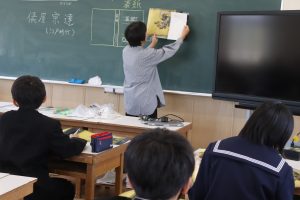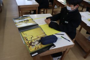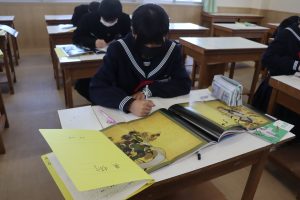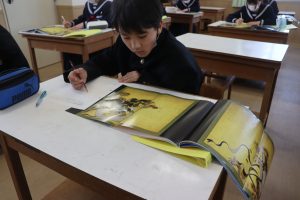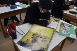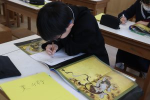 1年生の美術は風神雷神図を模写する学習です。