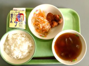 ごはん、牛乳、鶏の唐揚げ、白玉汁、紅白なます(にんじんと大根を使った酢の物で、紅白のコントラストが鮮やかにおせち料理をいろどります。色合いや細切りにされた形から祝いごとに使われる紅白の水引に見立てられ、平和への願いが込められています。)
