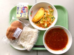 ロールパン、ソフト麺、牛乳、チーズオムレツ、ミートソース、フレンチサラダ。「給食つうしん」はこちらから