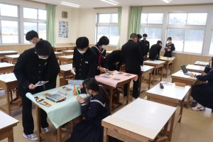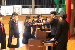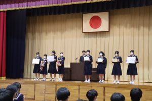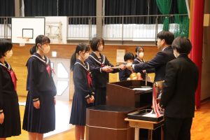 市造形コンクール、校内書き初め大会、ハンドボール大会で優秀な成績を修めたことへの伝達がありました。ハンドボール部は、春中ハンドの1/18(日)富山県代表に決定しました。是非がんばってください。