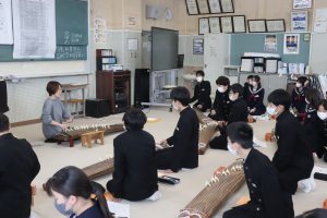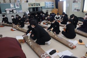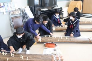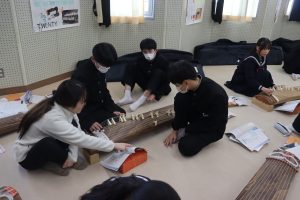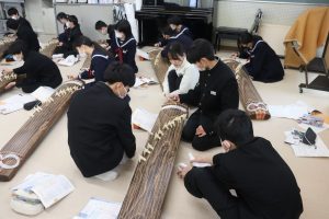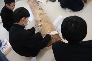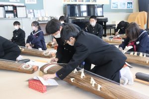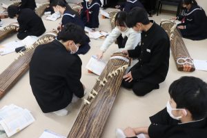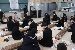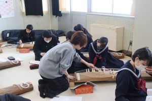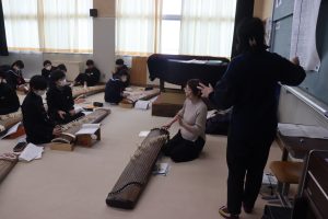 栄養教諭の尾山先生も加わり、爪ではじいたり、弦を指で押さえることで琴を奏でました。
