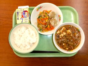 ごはん、牛乳、ポークシュウマイ②、麻婆豆腐、バンサンスー