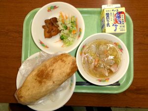 きなこ揚げパン(②,③年生のリクエスト1位)、牛乳、照り焼きチキン、コンソメスープ、グリーンサラダ