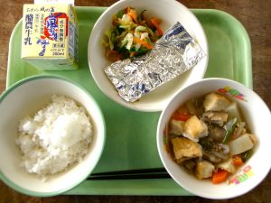 ごはん、牛乳、さば銀紙焼き、厚揚げと大根のそぼろ煮、キャベツの福神漬け和え