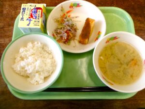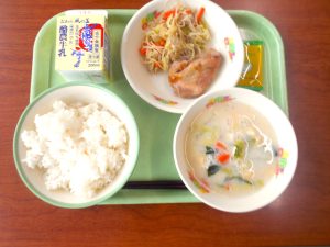 わかめごはん(リクエスト)、牛乳、鶏のから揚げ(リクエスト)、豚汁、フルーツヨーグルト和え、もものタルト「わかめごはんは、僕のリクエストです」2年生男子