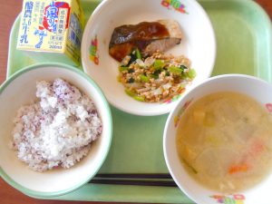 ゆかりごはん、牛乳、ふくらぎの照り焼き、さつま汁、納豆和え