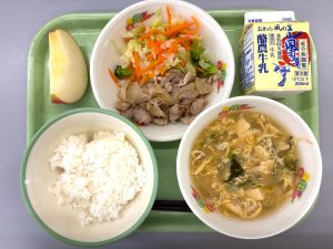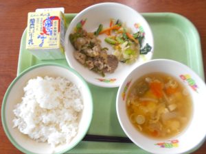 ごはん、牛乳、豚肉とタケノコの中華風炒め、かき玉汁、青菜のごまひたし