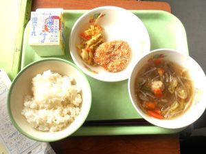 ごはん、牛乳、チーズソースハンバーグ(カルシウム強化)、かきたま汁、ビーフンソテー