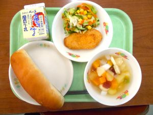 蜂蜜コッペパン、牛乳、チーズ入りささみフライ、フルーツポンチ、フレンチサラダ