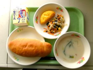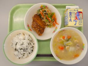 ごはん、牛乳、こずくらの竜田揚げ、さつま汁、小松菜の梅肉和え