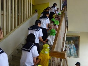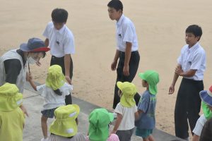 中学生は、グランドに避難した後、園児を抱っこしたり手をつないだりと支援をしながら避難しました。少し緊張しながらも、園児を気遣う優しい姿が見られました。また、みどり保育園の子供たちも、大変しっかりとがんばっていました。