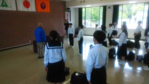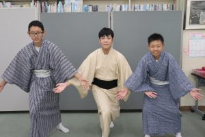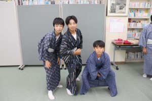 2年生家庭科の授業で、図書館司書の金森さんにもお手伝いをしていただき、浴衣の着付けをしました。