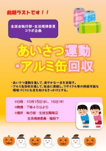 10/10 十三の日(告知) 2025年10月10日 2025年トピックス, 2025年度2学期, おしらせ, 学校トピックス 次回の十三の日は10月15日(水)と16日(木)です。あいさつ運動とアルミ缶の回収を行います。 Post Views: 15