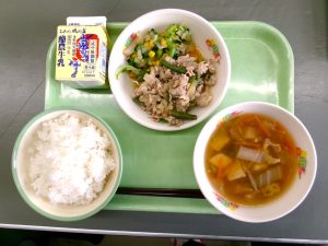 ごはん、牛乳、豚肉のピリ辛みそ炒め、白玉汁、コーン和え