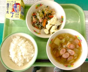 ごはん、牛乳、チーズソースハンバーグ、ポトフ、キノコと野菜のソテー