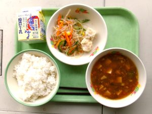 ごはん、牛乳、コーンしゅうまい、麻婆豆腐、バンサンスー