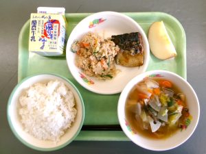 ごはん、牛乳、さばの味噌煮、ふきよせ汁、卯の花煮、りんご